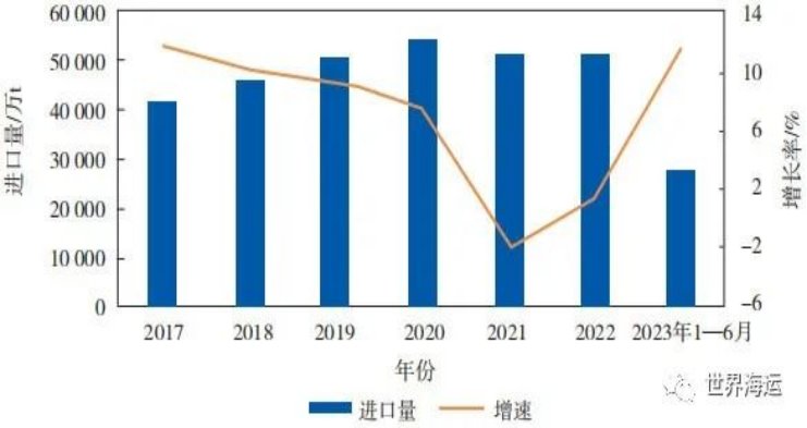 圖2 2017—2023年上半年中國原油進口及增長情況