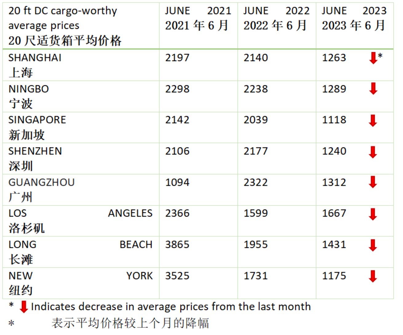 紐約的20尺干箱在2021年6月的價(jià)格高達(dá)6500美元,現(xiàn)已在2023年6月(第1周)暴跌82%,降至1175美元。