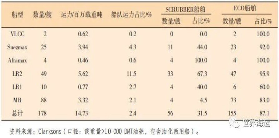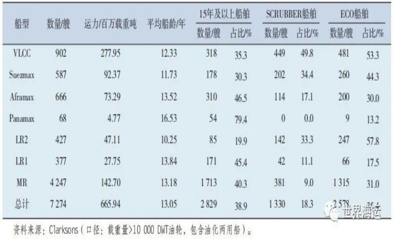 從現(xiàn)有油輪運力結(jié)構(gòu)來看,全球油輪運輸船隊平均船齡偏大。Clarksons數(shù)據(jù)顯示,截至2023年上半年,全球油輪總數(shù)量為7 274艘,共計約6.66億載重噸,平均船齡約為13.05年,見表2。具體來看:生態(tài)型 ( ECO ) 船舶及安裝脫硫塔 ( SCRUBBER ) 船舶的數(shù)量分別占船隊總數(shù)量的18.3%和35.4%,其中VLCC船型以及LR2船型中ECO船舶的數(shù)量占比均超過其船隊總量的50%,船隊船齡相對略低;而傳統(tǒng)巴拿馬船型因需求不足,運力逐年萎縮,是油輪運輸船隊中老齡化最明顯的船型。
